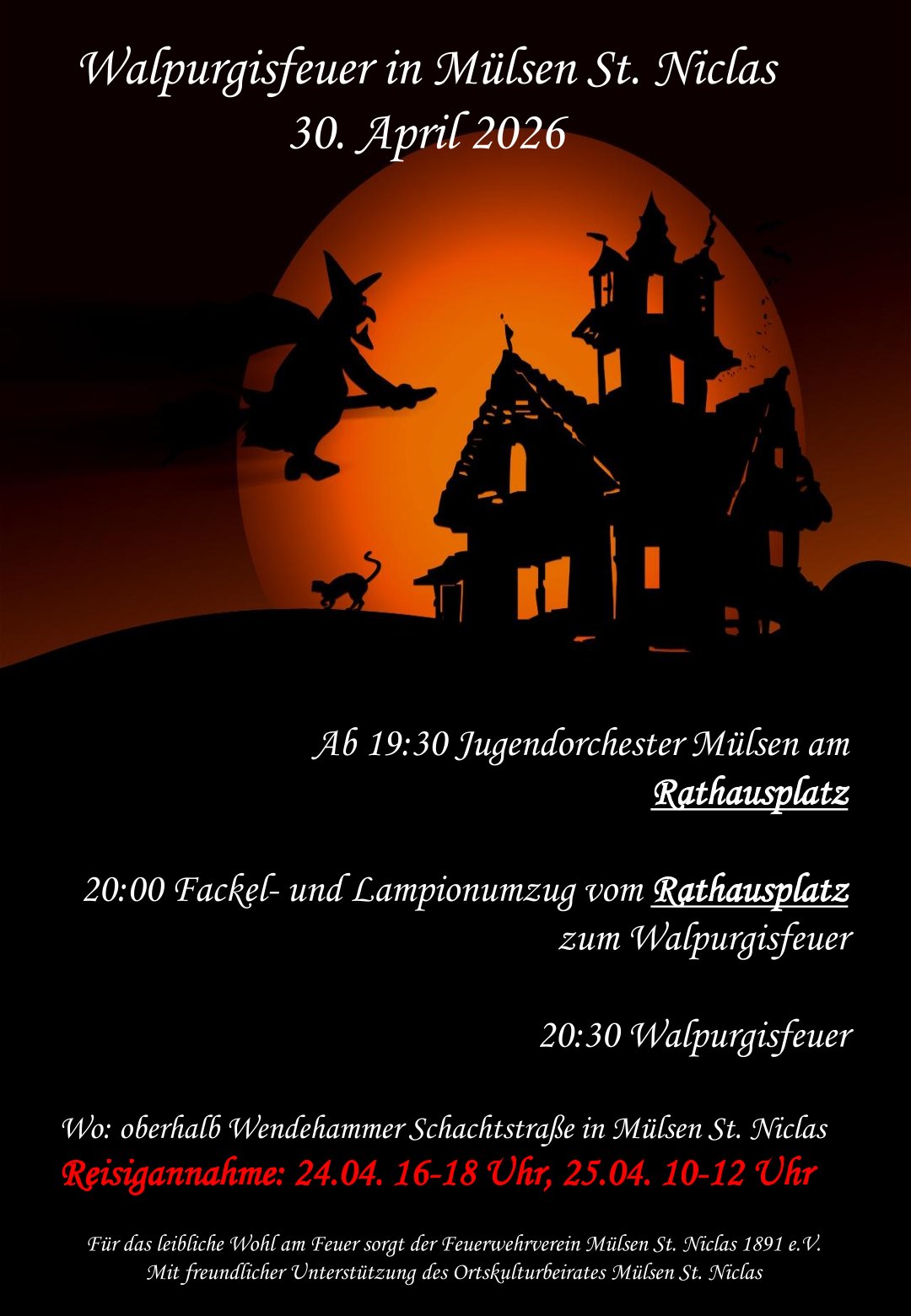 20:30 Uhr Walpurgisfeuer; Wo: oberhalb Wendehammer Schachtsstraße in Mülsen St. Niclas